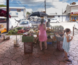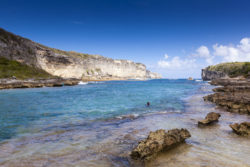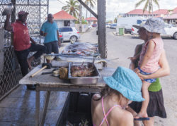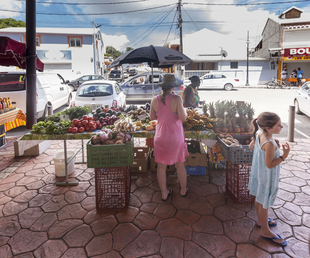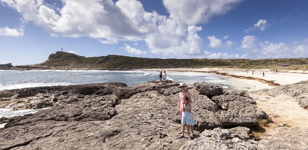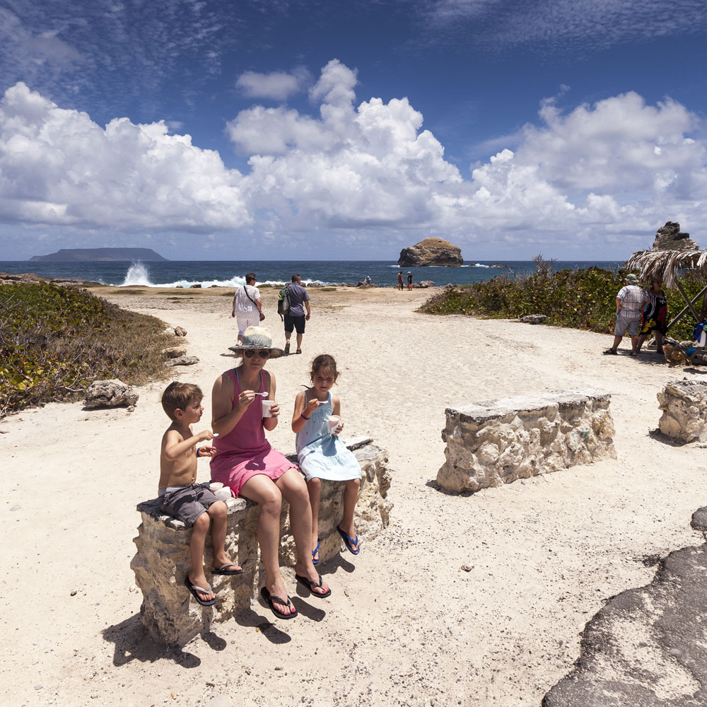 On our first full day in Guadeloupe we venture to the most southeastern tip of the Guadeloupe “continent” (as the two main islands of Grande-Terre and Basse-Teree are called) to Pointe des Châteaux: a picturesque archipelago stretching out into the ocean with a hiking trail and grand crucifix overlooking the rugged ocean. Looking back towards the island from the point we spotted the beach of Plage Grande Anse des Salines, and spent the morning snorkeling and swimming in the protected waters behind the barrier reef. Both kids took to their masks and snorkels like they’d only used them yesterday, the water was teeming with aquatic life and quite a bit of coral. We found a local woman selling fruit and coconut sorbets – a very welcome treat in the near-100% Caribbean humidity – before we made our way back to Sainte-Francois via some of the local art galleries.