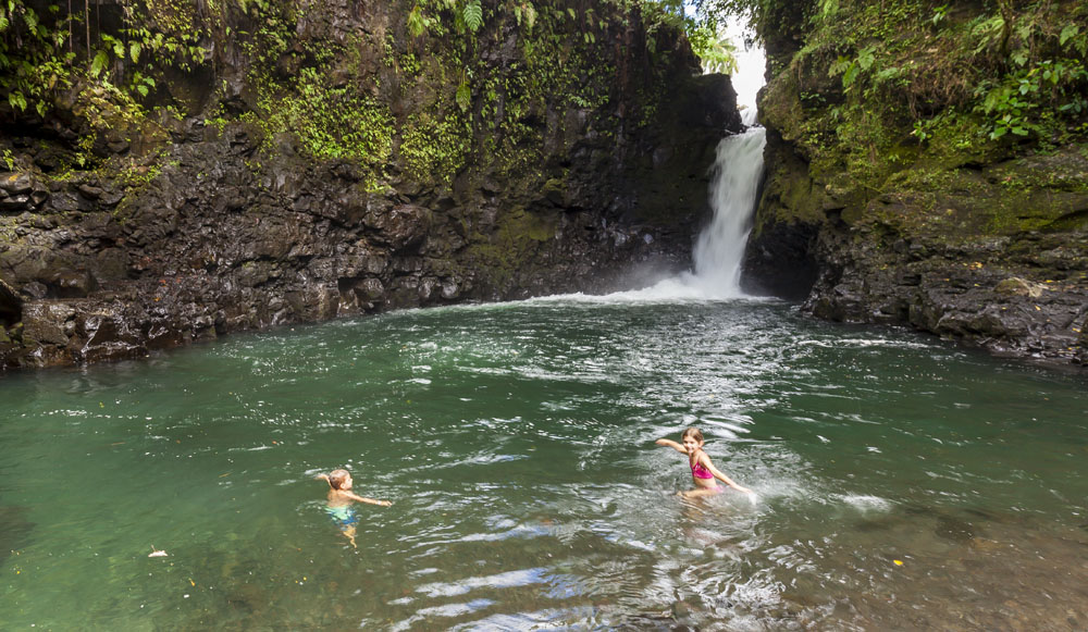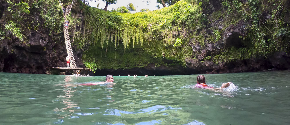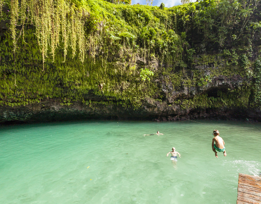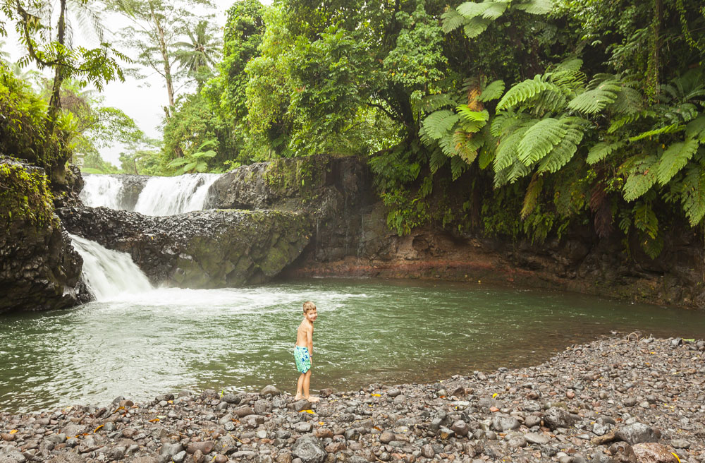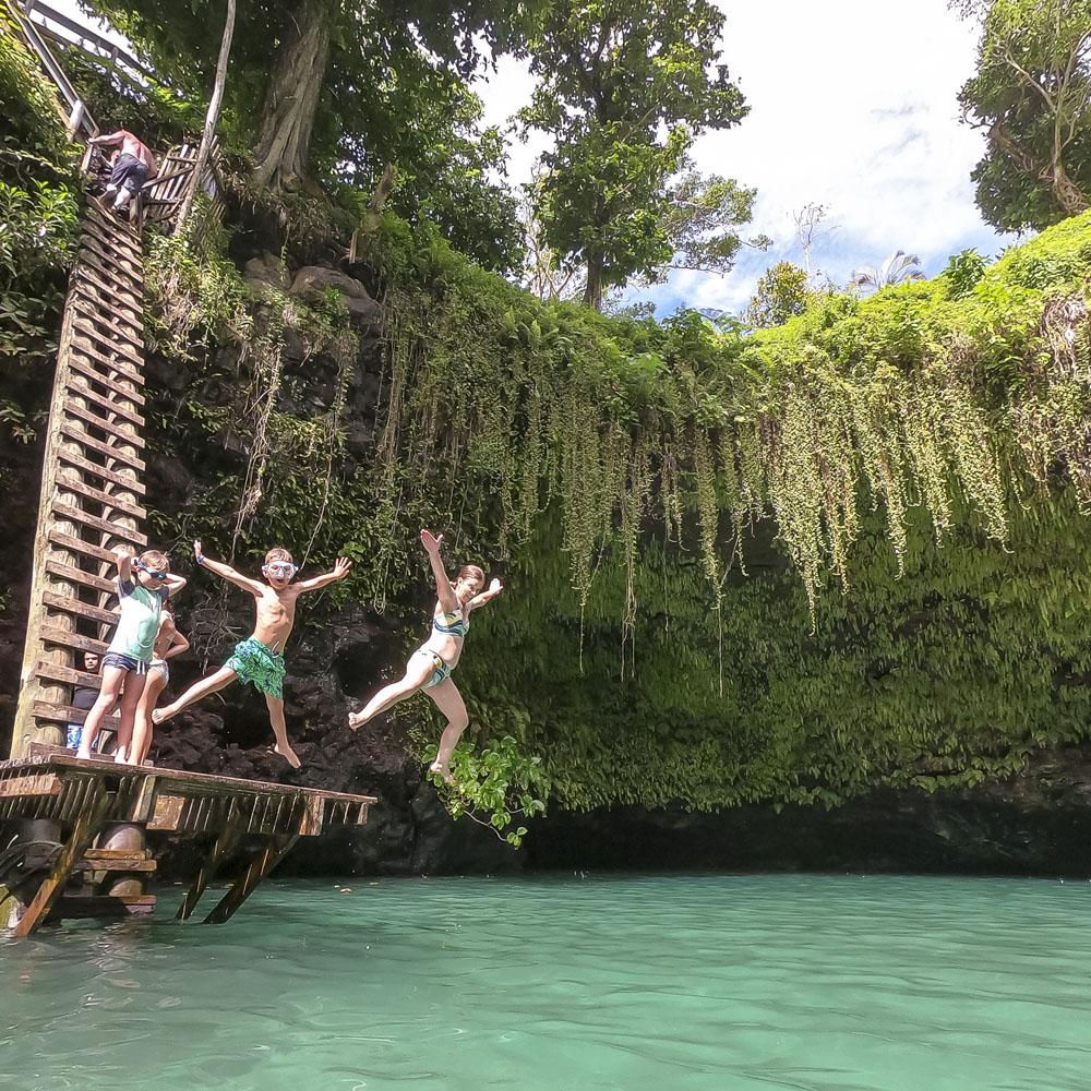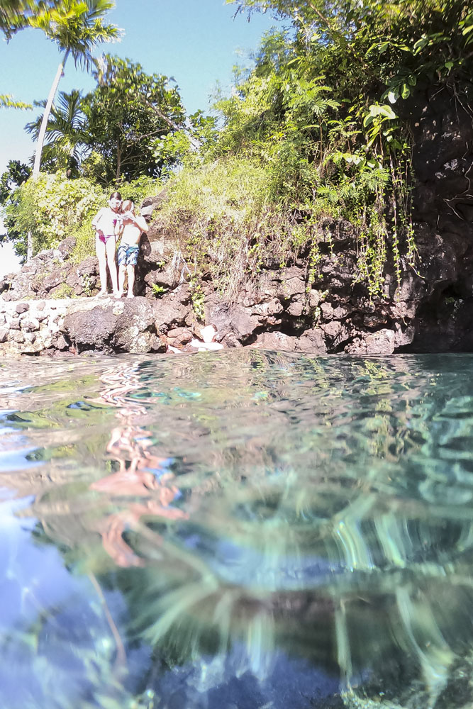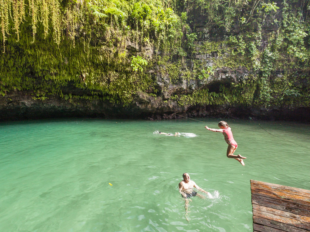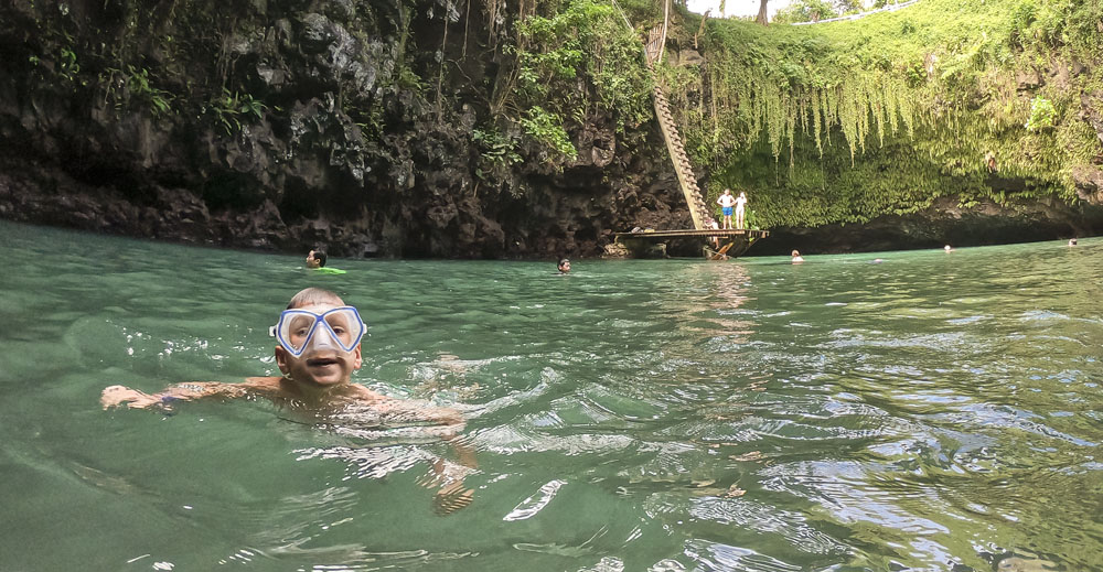 In the kids’ opinions, Hallsy saved the best adventures for last: following our morning in Apia we spent our last full day on an adventurous excursion up into the mountains to Sauniatu Falls and then to the cave pool below Piula Theological College. Sauniatu is definitely a locals-only spot, getting there entailed six kilometers/four miles up a rough dirt road that wasn’t even on my phone’s maps app. We had the place to ourselves for an hour or so until some of the local village boys came to join us for a swim. A majestically beautiful spot, Lilia and Max were in heaven, one of the most beautiful waterfall settings I’ve ever visited, without a doubt… The local boys were diving and flipping off the cliffs surrounding the falls, even climbing behind the cascades and jumping through the torrent into the plunge pool. Max was in awe. The cave pool at Piula was pretty awesome too, it’s fed by a freshwater aquifer and the clarity of the water was astonishing (albeit a little chilly!).