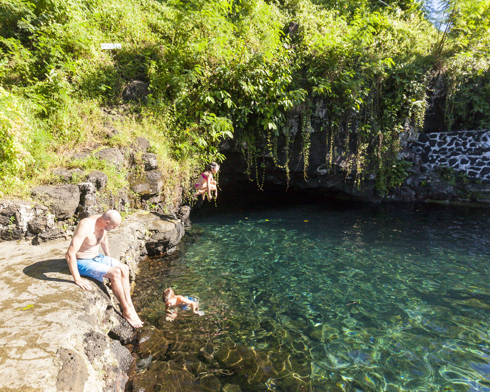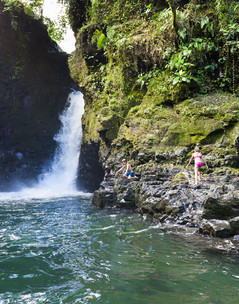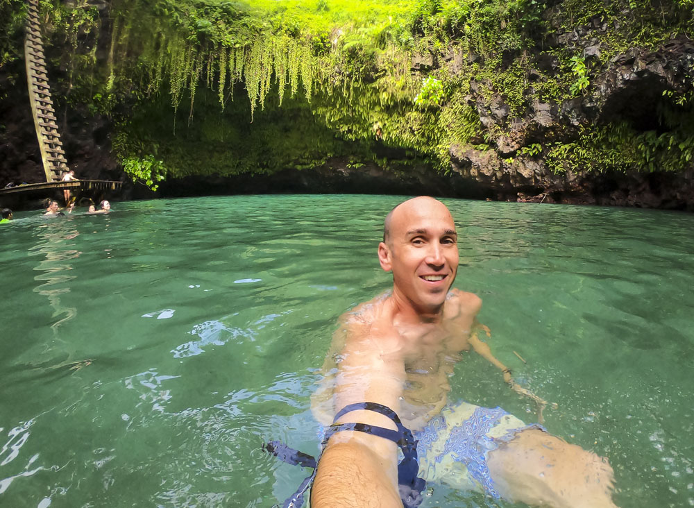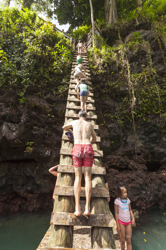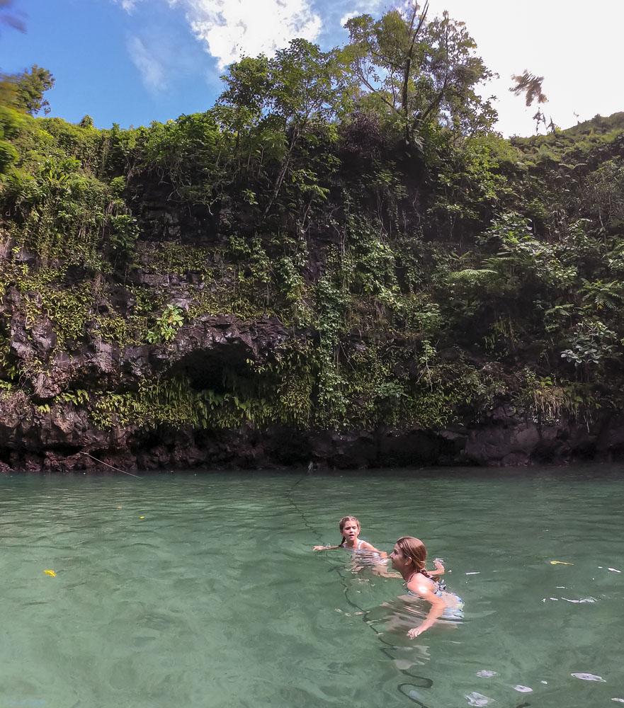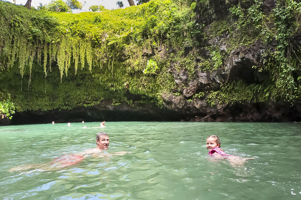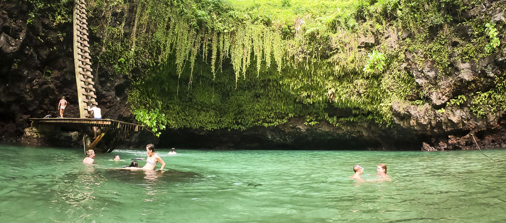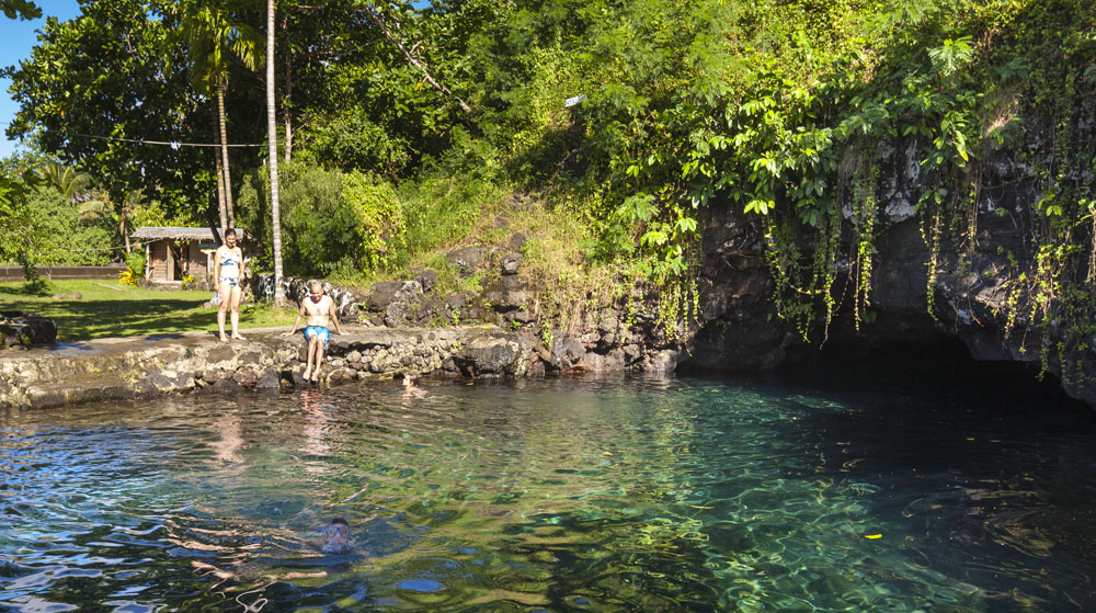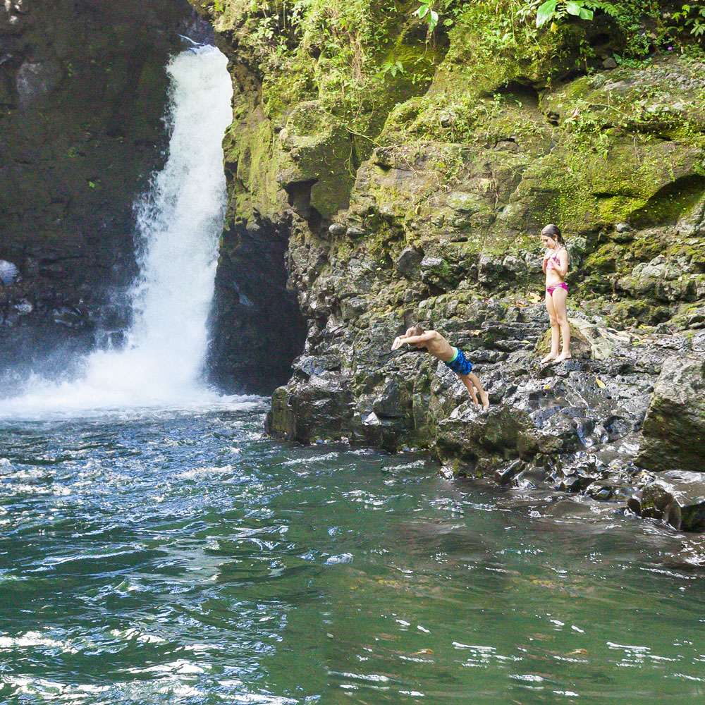 In the kids’ opinions, Hallsy saved the best adventures for last: following our morning in Apia we spent our last full day on an adventurous excursion up into the mountains to Sauniatu Falls and then to the cave pool below Piula Theological College. Sauniatu is definitely a locals-only spot, getting there entailed six kilometers/four miles up a rough dirt road that wasn’t even on my phone’s maps app. We had the place to ourselves for an hour or so until some of the local village boys came to join us for a swim. A majestically beautiful spot, Lilia and Max were in heaven, one of the most beautiful waterfall settings I’ve ever visited, without a doubt… The local boys were diving and flipping off the cliffs surrounding the falls, even climbing behind the cascades and jumping through the torrent into the plunge pool. Max was in awe. The cave pool at Piula was pretty awesome too, it’s fed by a freshwater aquifer and the clarity of the water was astonishing (albeit a little chilly!).
