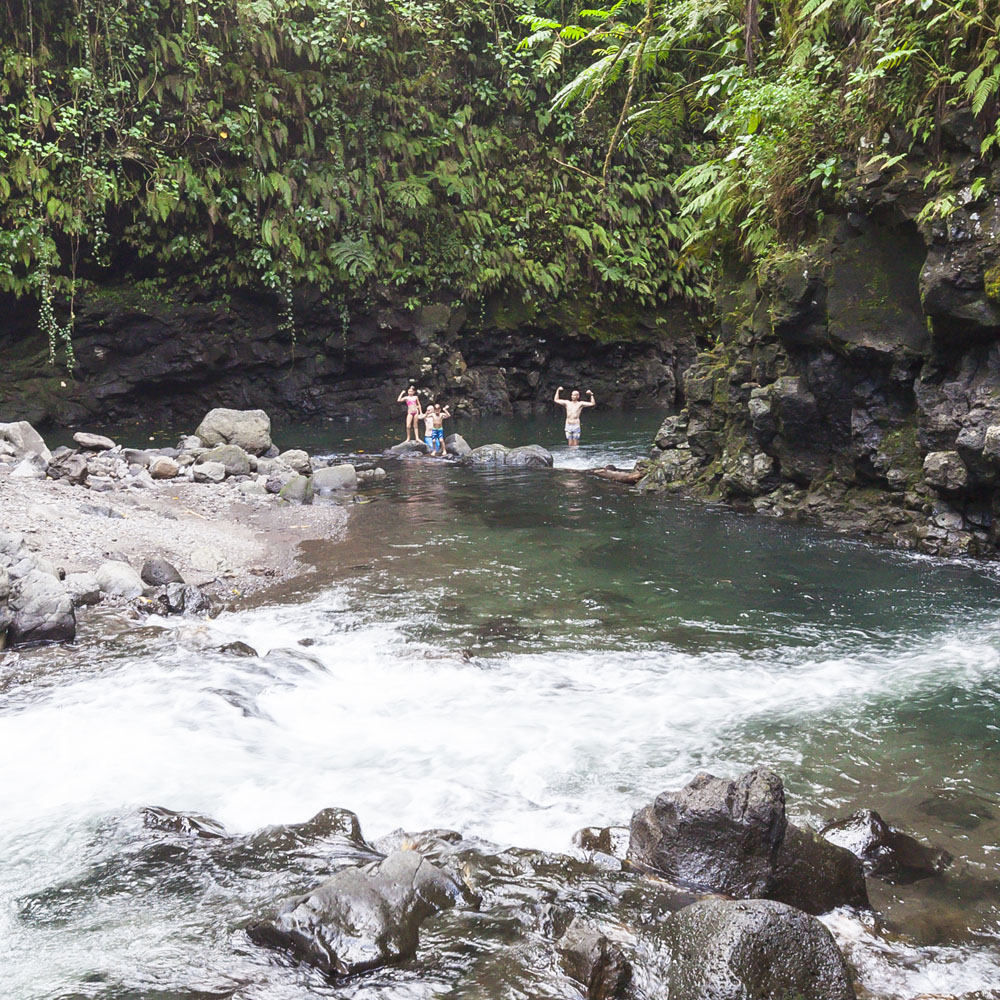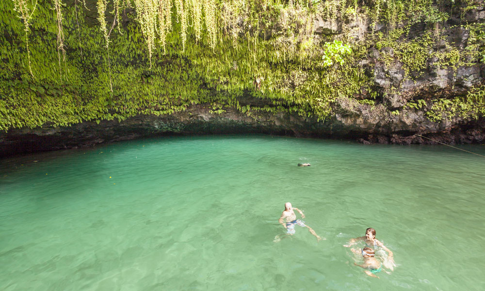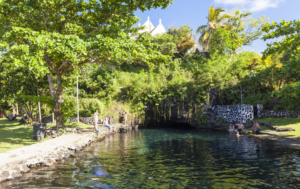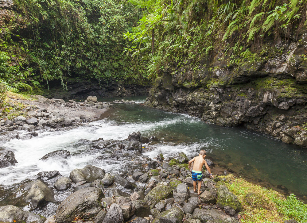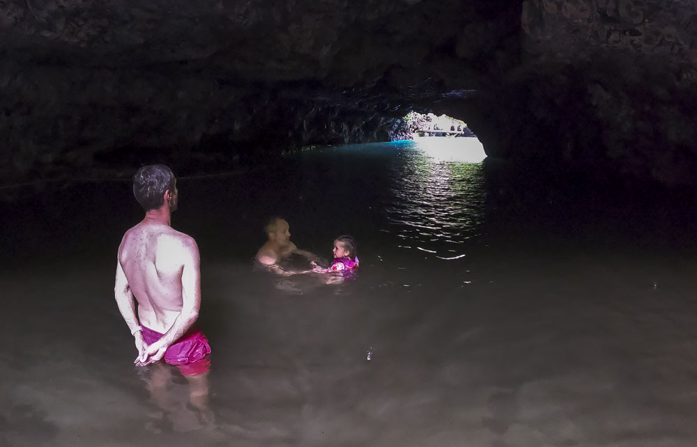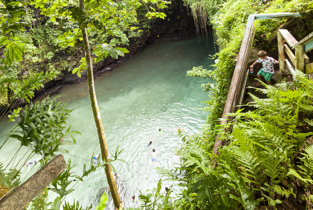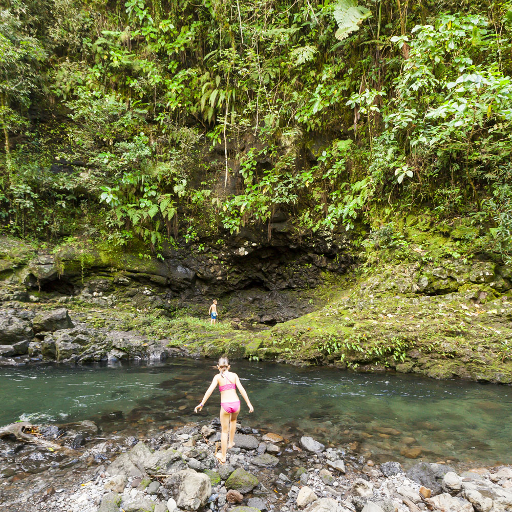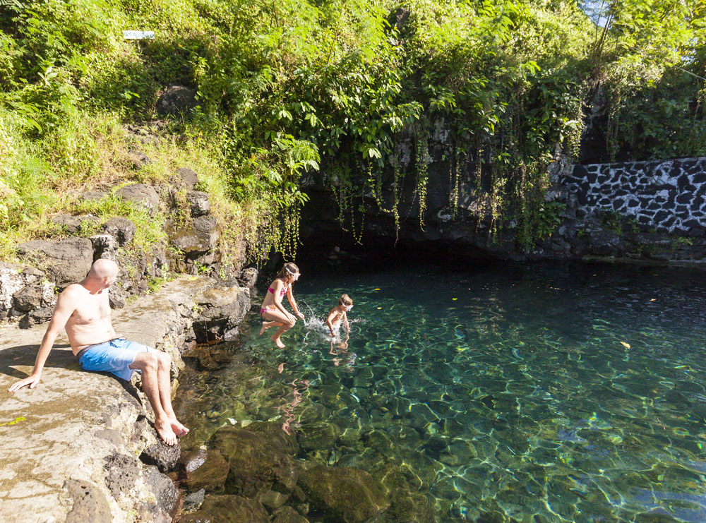 In the kids’ opinions, Hallsy saved the best adventures for last: following our morning in Apia we spent our last full day on an adventurous excursion up into the mountains to Sauniatu Falls and then to the cave pool below Piula Theological College. Sauniatu is definitely a locals-only spot, getting there entailed six kilometers/four miles up a rough dirt road that wasn’t even on my phone’s maps app. We had the place to ourselves for an hour or so until some of the local village boys came to join us for a swim. A majestically beautiful spot, Lilia and Max were in heaven, one of the most beautiful waterfall settings I’ve ever visited, without a doubt… The local boys were diving and flipping off the cliffs surrounding the falls, even climbing behind the cascades and jumping through the torrent into the plunge pool. Max was in awe. The cave pool at Piula was pretty awesome too, it’s fed by a freshwater aquifer and the clarity of the water was astonishing (albeit a little chilly!).