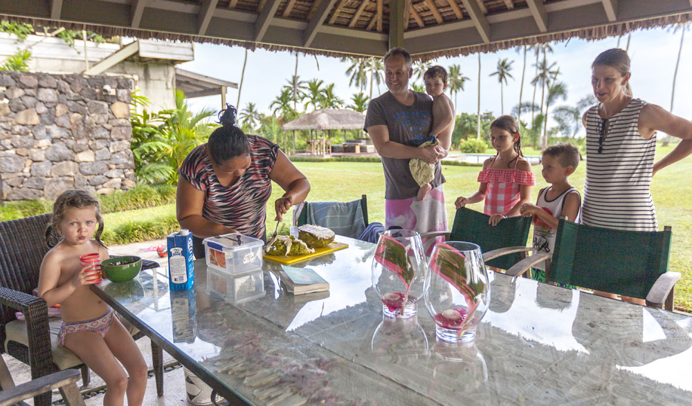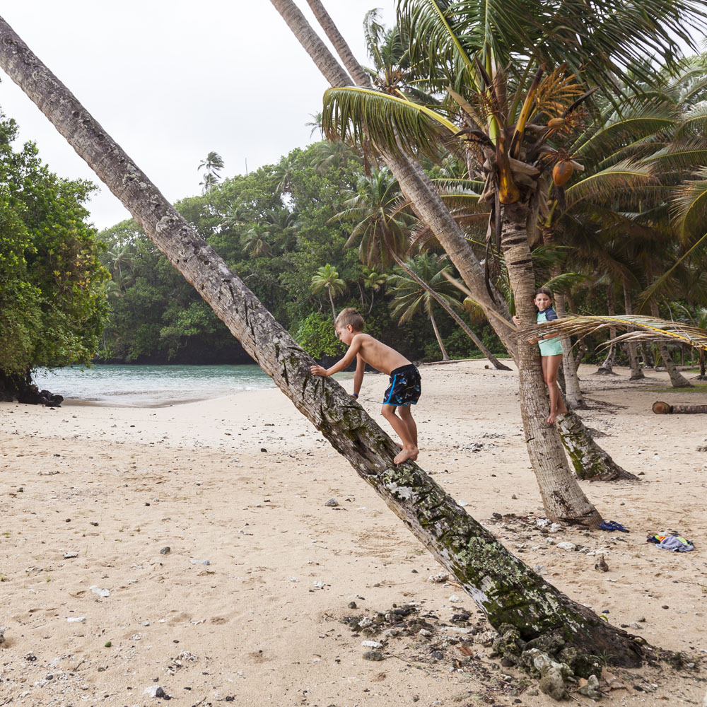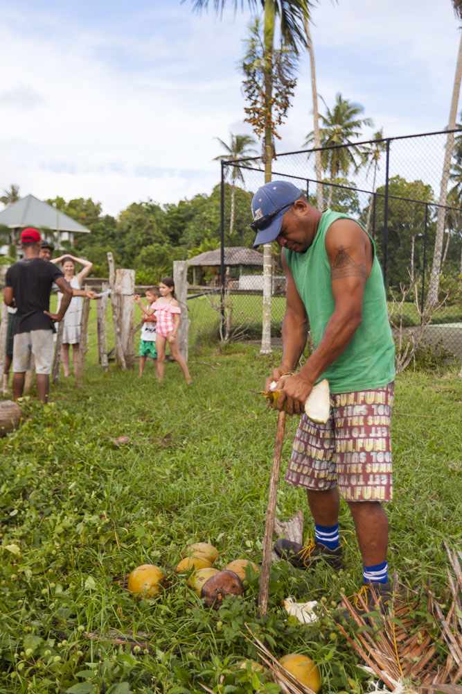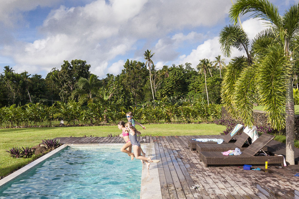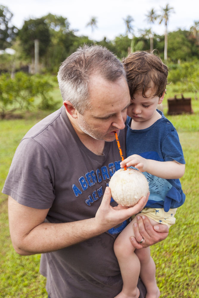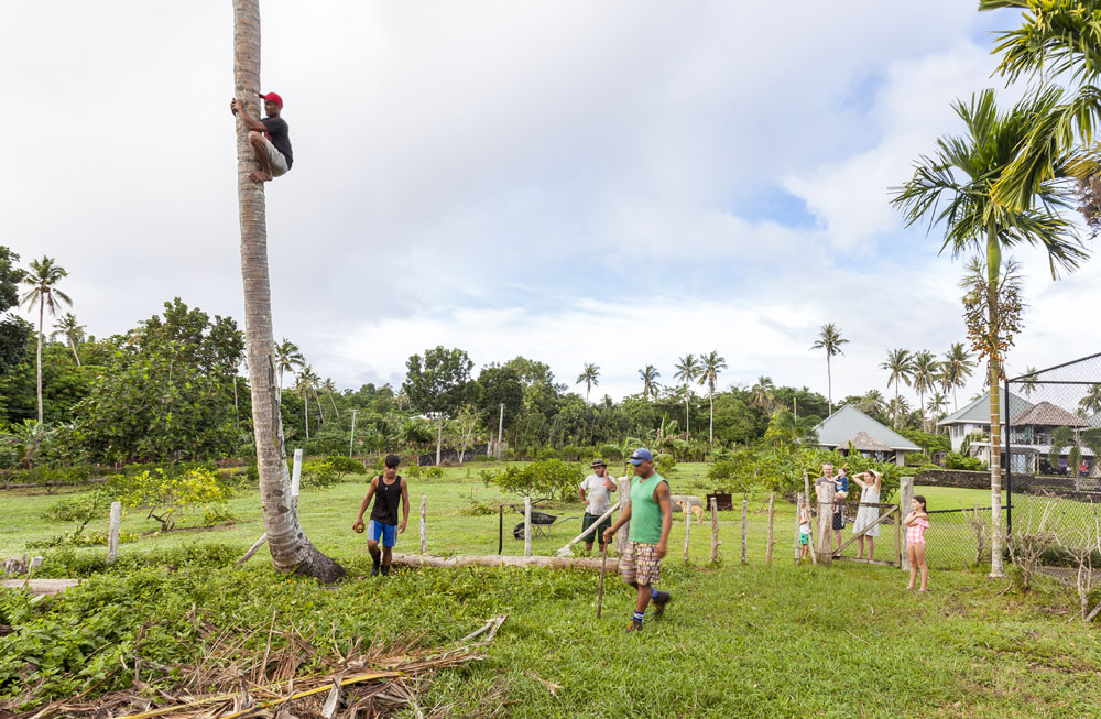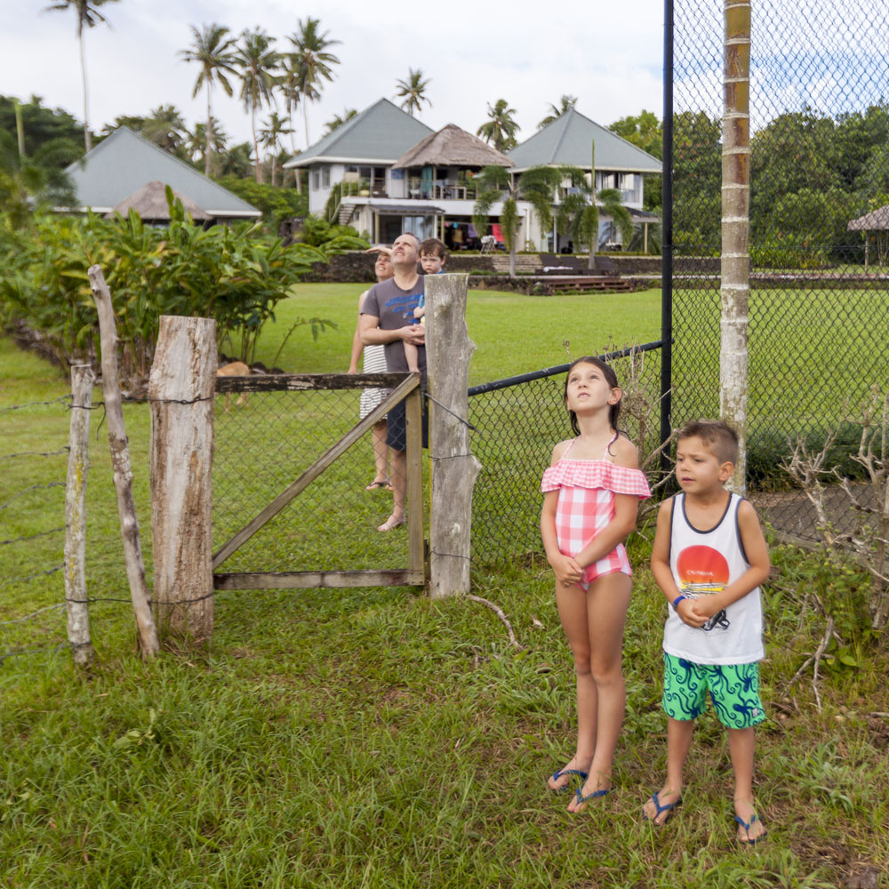 The Littles and Valtenbergs stayed at Ifiele’ele Plantation on the northwest coast of Upolu, a beautiful spot in the jungle a few kilometers inland from the ocean. The plantation is run by a New Zealander who married an Aussie woman and moved to Samoa 10 years ago, they run a self-catering villa on the plantation as well as producing pretty much every kind of organic tropical fruit one can imagine. It was an ideal spot for the kids to run around and the three families to gather, the pool providing endless hours of enjoyment for the kids and the open grass seeing a few games of backyard cricket during our stay. The plantation staff would harvest fresh coconuts for us to drink and provided us with a dizzying array of local fruit, even cooking us up local dishes to sample one afternoon. The sasalapa was something I’d never seen before, quite a lot of work to deseed but great to freeze for our morning smoothies. The kids were quite enamored with the staff climbing the coconut trees to pull niu coconuts for us!