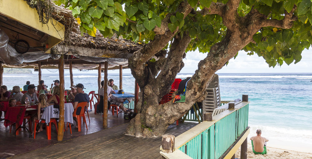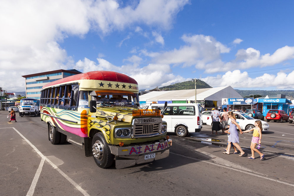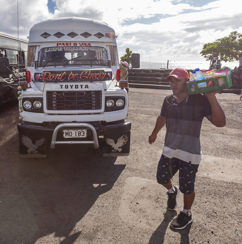 We had a day-and-a-half to ourselves at the end of the trip, as the McCabes and Littles headed back Down Under before we were due to head home. We spent the morning in central Apia, with breakfast at our favorite Cafe Nourish, and then caught a couple of games of rugby at the Pacific Games. The Pacific Games is a gathering of all the Pacific island countries that’s held every four years, the Games were underway during our stay and we were lucky enough to catch the home country’s sevens play neighboring American Samoa as well as Papua New Guinea play Solomon Islands. The open air markets on the Apia waterfront were a good spot to grab a few souvenirs, and I was also able to snap some shots of the colorful buses that circle the island. I loved the buses: Nissan and Toyota diesel contraptions from yesteryear painted with all manner of decorations. Each one had its own name and they were typically packed to the gills with locals. It didn’t seem like too many of the locals owned cars of their own, which is understandable given the median annual income in Samoa is roughly US$10.5K. The low level of income makes the purchase of a car a huge investment, and explains why the islanders like to protect their investment by driving drive at speeds of 40KPH/25MPH on the open roads, or even as slow as 15KPH/10MPH on the many rougher sections of the island. 99% of the roads are single lane, definitely made for some interesting driving… The Samoan taxis were especially frustrating, often holding up scores of cars on Upolu’s main coastal road as they crawled along. The owner of Ifiele’ele commented that even after living in Samoa for 10 years the Samoan drivers still drive him nuts! They’re on island time, they have all the time in the world…