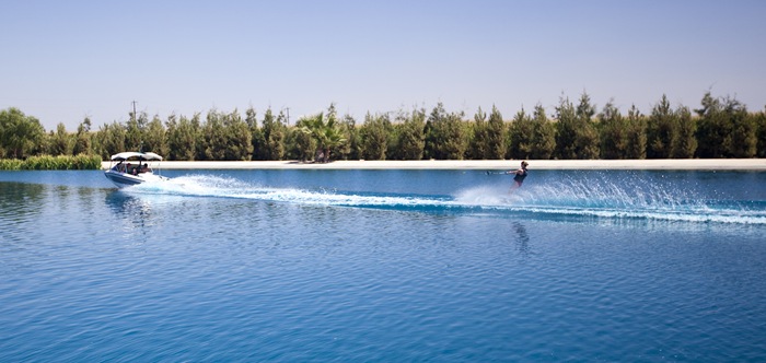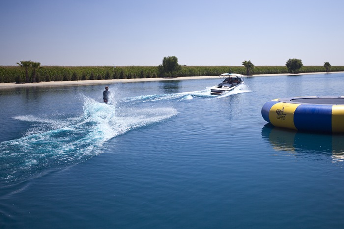 roads between the surrounding dairies but were absolutely in awe as we exited the walls of silage corn on a neighboring dairy to find a hidden waterskiing oasis. Kevin told us that the owners of the lake had been building a new milking barn and wanted to raise it up a few feet to guard against flooding. So they requested approval to build a “fish lake” where the hole was left by excavating the dirt to raise the barn. The result is the unbelievable waterskiing heaven pictured here. They put some serious thought into construction: islands at each end for turnaround, a full slalom course, rails for wakeboards, a covered deck over the water and endless water toys to keep the little ones amused. We had an absolute blast, Lisa was in her element with a proper waterski boat to pull her and Lilia very much enjoyed a couple of swims in the bathtub-warm water. Great idea Kevin!