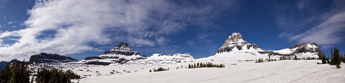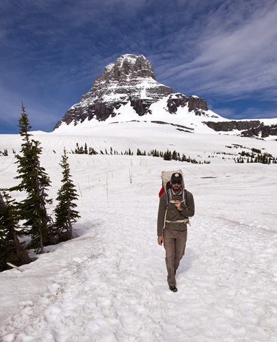 to west, crossing the Continental Divide along the way – had only opened two days before we arrived in the park due to too much snow blocking the plows. As we drove from Sunrift Gorge up the breathtaking valley above Saint Mary’s Lake we slowly made our way out of the lush forest, above the tree line and up into the snowpack. Jackson Glacier came into view as we wound our way around Siyeh Bend, by the time we made it to our destination at Logan Pass on the top of the Continental Divide we were completely surrounded by snow. We waited for Lilia to finish her morning nap before heading out across the snowpack to Hidden Lake Overlook, a short walk past Mount Oberlin and Clements Mountain, made a little tricky by the fact that the trail was buried under a few meters of snow! Lilia unfortunately had her last of four baby molars coming through while we were in Glacier so was a little out of sorts and very lethargic. I think the altitude may have been getting to her a little as well… She spent most of the day asleep in the pack under her sun shade, which is too bad because she missed out on some amazing vistas and breathtaking scenery.