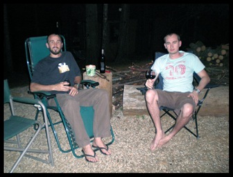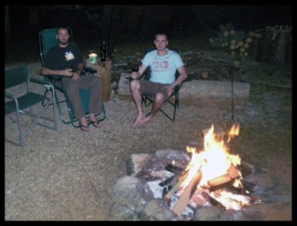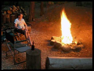 Greg enjoys the fire and a beer at the cabin in Arnold (right)