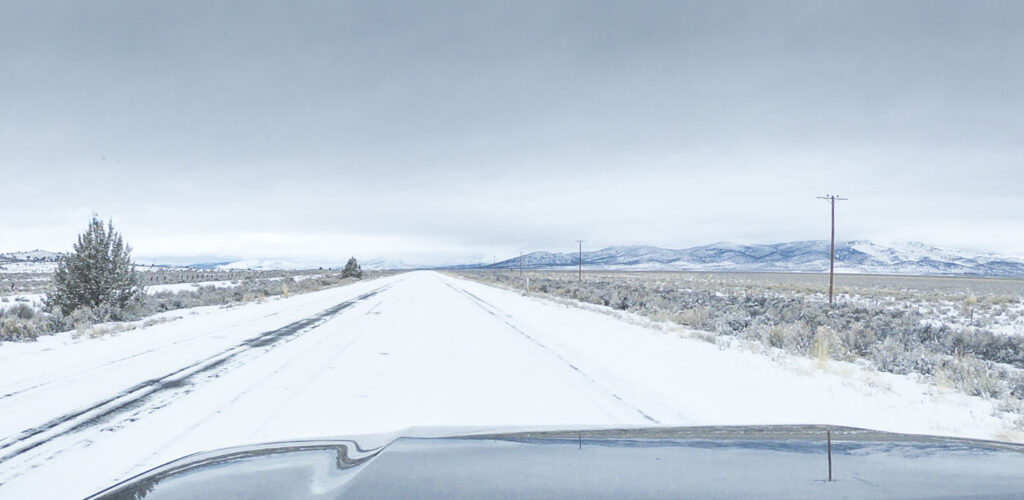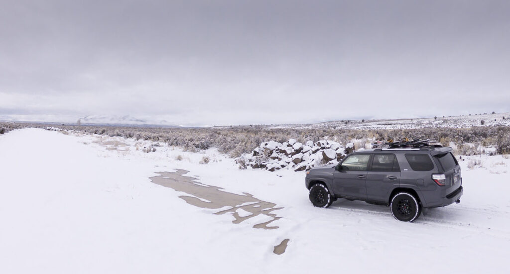 It was a roughly six hour drive from Reno to Bend, desolate high desert roads with some periods of more than half an hour without seeing another vehicle on the road. Of the roughly 410 miles/660 kilometers it was snowing for close to 250 miles/400 kilometers, fortunately it was dry snow and it was cold enough that the roads didn’t ice up. Some big country out there in Modoc County, with vistas that seemed to go on forever and the occasional wild horse visible from the road. The 4Runner definitely proved itself on the stretch.