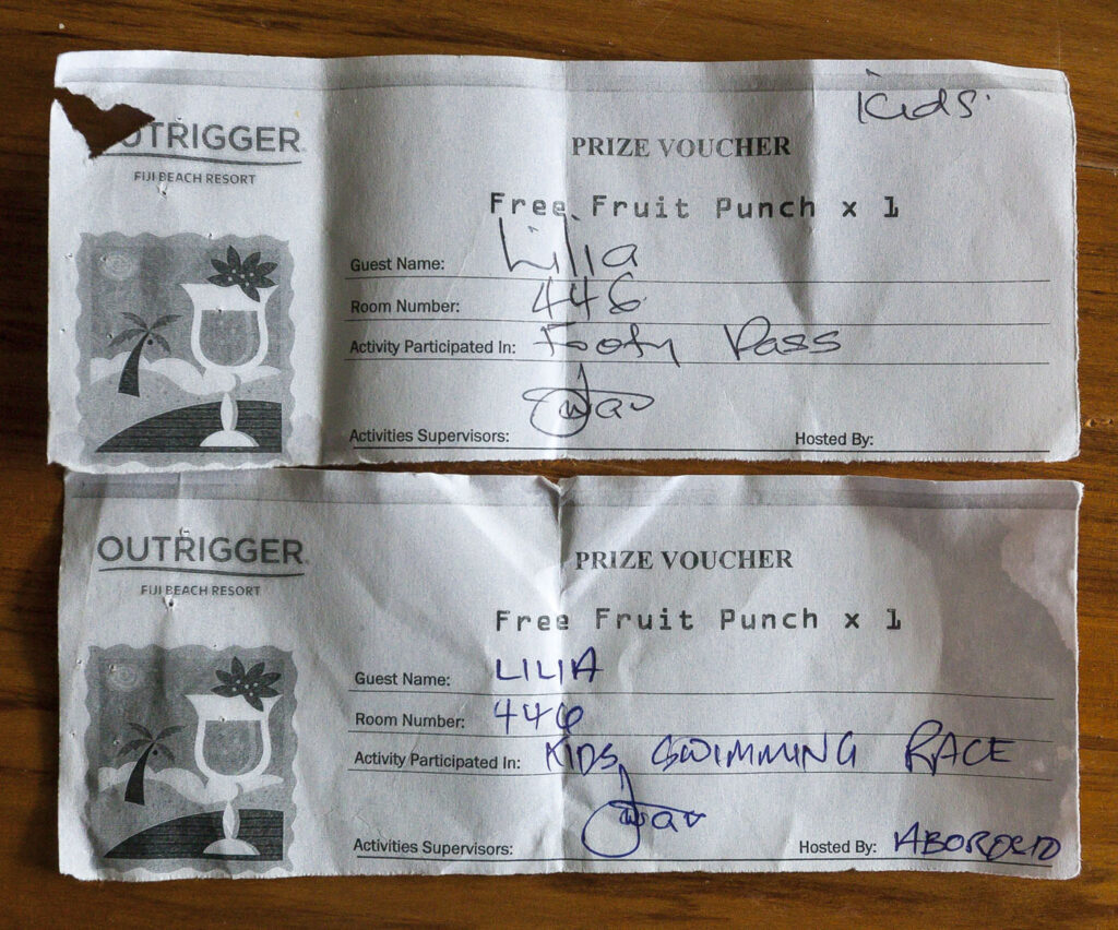 We don’t usually go full resort when we travel – typically opting for vacation rental houses as bases to explore new places – but given we were only in Fiji for a few days we rolled the dice on the Outrigger Fiji Beach Resort. It was a great choice. Our bure was a wonderful spot to spend a few days, the hammock on our deck received plenty of use and we loved the afternoon high teas delivered by the friendly resort staff: ice cold beers with an assortment of pastries and appetizers was a perfect way to wind up each day following afternoon happy hour at the pool. The kids had a ball roaming the property solo, making friends in the pool and coming to find Lisa and I when they needed something. Lisa was quite proud of Lilia winning the resort swimming comp and rugby throw one afternoon as the only Californian in a mix of Aussie kids!
