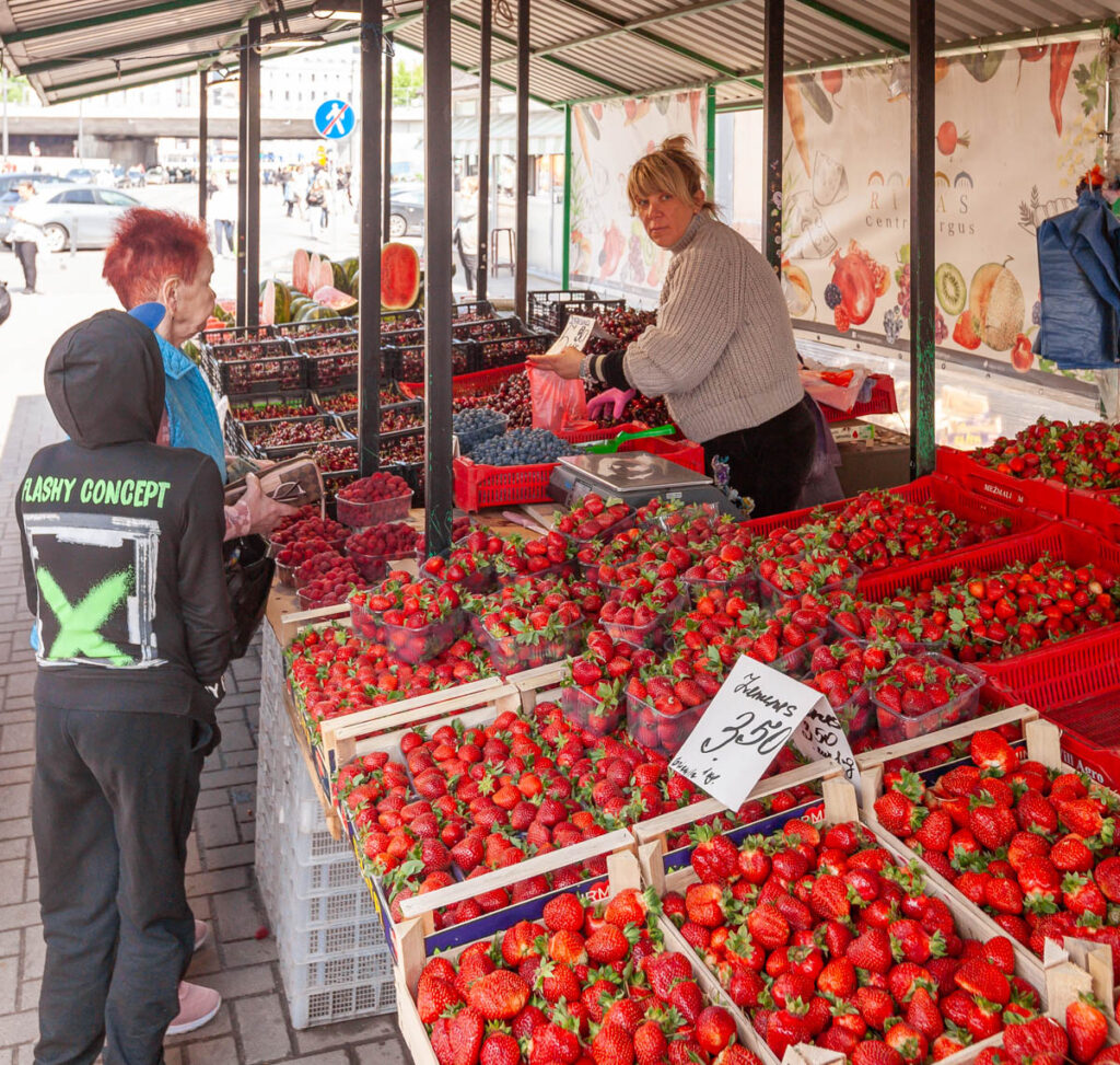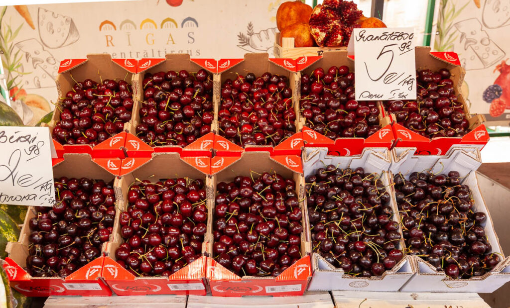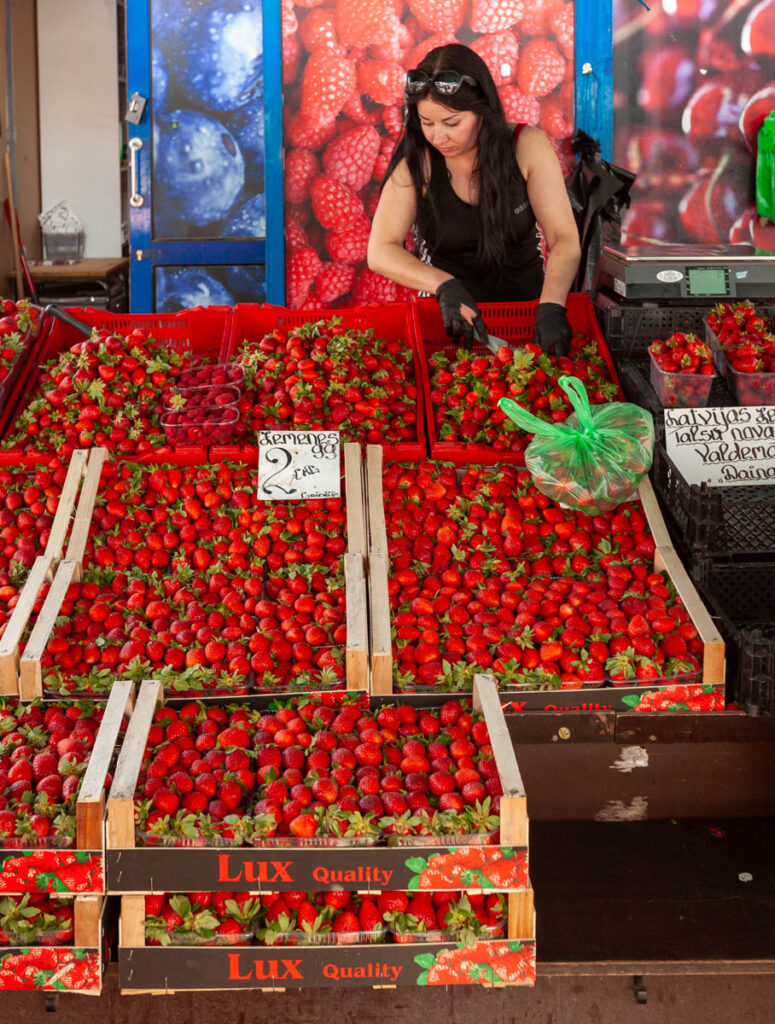 Riga’s central market is the largest market in Europe (a fact I didn’t know before visiting). Located a stone’s throw from old town Riga on the banks of the Daugava River, the sprawling campus of four airplane hangar-sized halls and literally hundreds of outdoor stalls had everything from fresh produce to clothing on offer. It was quite a sight to behold. As in Tallinn, the berry season in Northern Europe was in full force when we visited, there were scores of vendors selling the most luscious-looking strawberries, blueberries, raspberries and cherries with hundreds of locals queuing to take home as many as they could physically carry. The strawberries were very cheap at anywhere between โฌ2.50 and โฌ10.00 per kilogram (which equates to about US$1.30 to US$5.25 per pound). Supply and demand… There were small tractors bringing the berries into the marketplace vendors by the pallet, as quickly as the vendors could put them on display they were bought and refilled with more. We bought a bag full of cherries as we ate our way through the market, so rich and perfectly ripe.