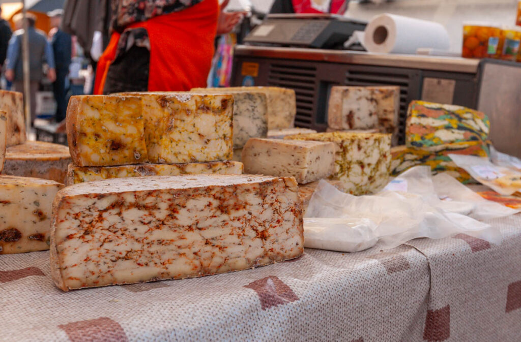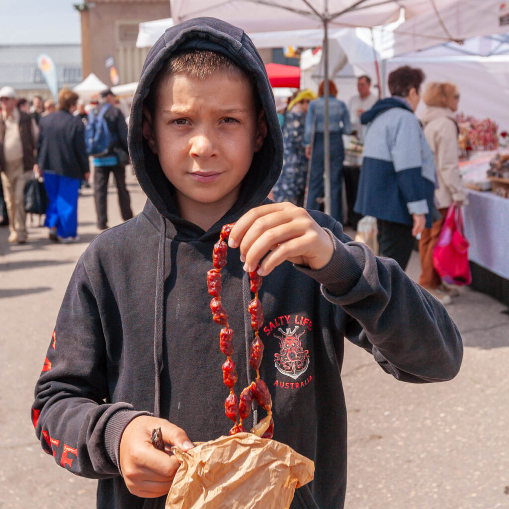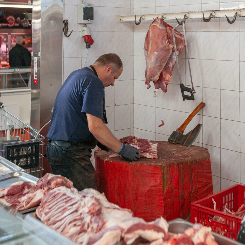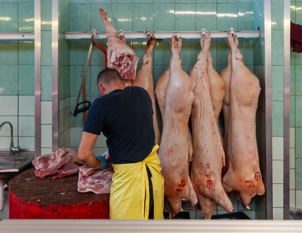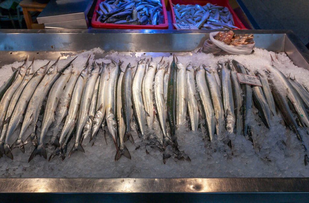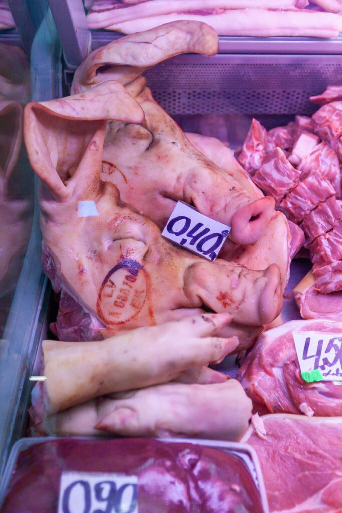 Max was enamored with the butchers in the expansive meat hall. They all had large, round wooden blocks on which to work, using hand saws and axes that looked like they were pulled off a viking ship to prepare carcasses of everything from hogs to beef, goats and lamb. The slabs of spiced pork fat on offer were something we’d never seen before, the line queued to purchase them was one of the longest we saw during our time at the market. While the aroma of the seafood hall certainly took us some getting used to, the array of fish on offer was absolutely mind blowing. The photos below depict it better than I describe, I still can’t get over the variety of species being sold (especially the smoked and dried fare).