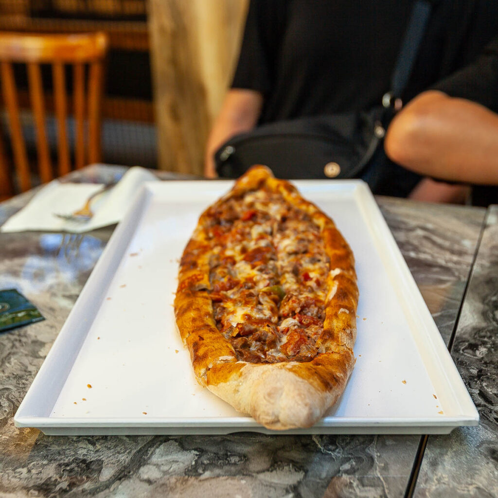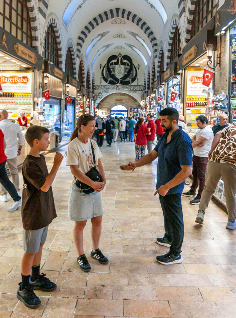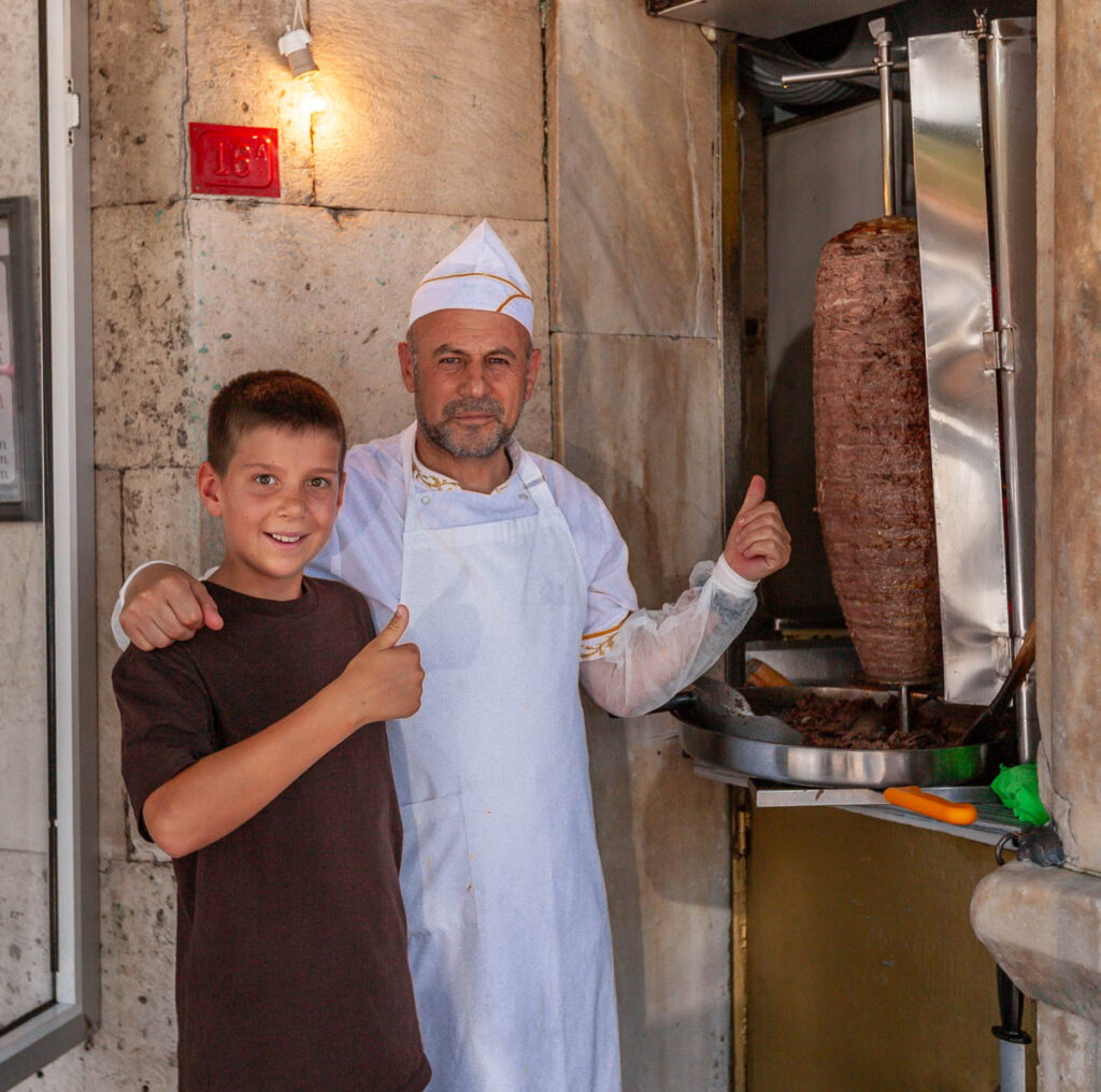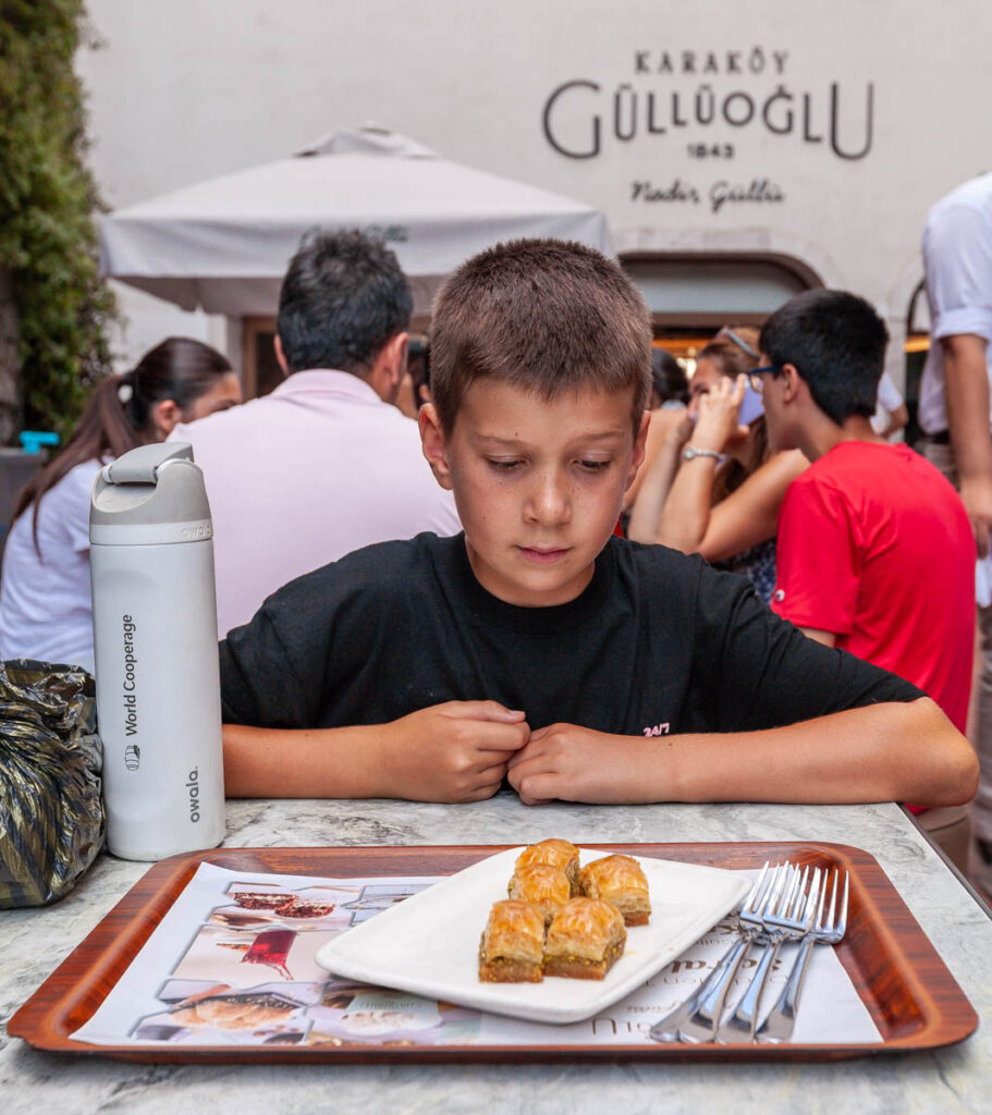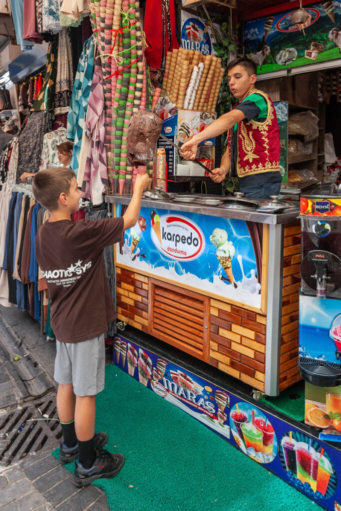 The eclectic mix of food on offer in Istanbul was great. The street eats were excellent and focused mainly on pide – a pizza-like flatbread – and an array of spit-roasted meat vendors. And we can’t forget the boreks, which the kids ate by the bucket load for breakfast and afternoon snacks. We also made sure to have our fill of Turkish coffee, something I discovered on my first visit to Istanbul when I mistakenly drank the “mud” at the bottom of the cup (rookie mistake…) and had quite the unsettled stomach for the rest of the day! Max had done some research on food in Turkey prior to our visit and was laser focused on locating a Turkish ice cream vendor to experience the tricks he’d watched on YouTube firsthand. It wasn’t hard to find one and indeed they were quite impressive with the gooey Turkish ice cream, I think the kids treated themselves to a serving every day we were in the city.
