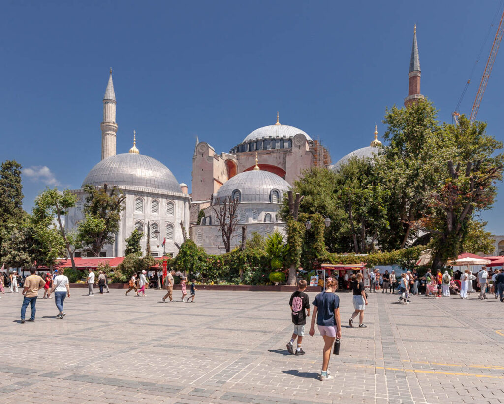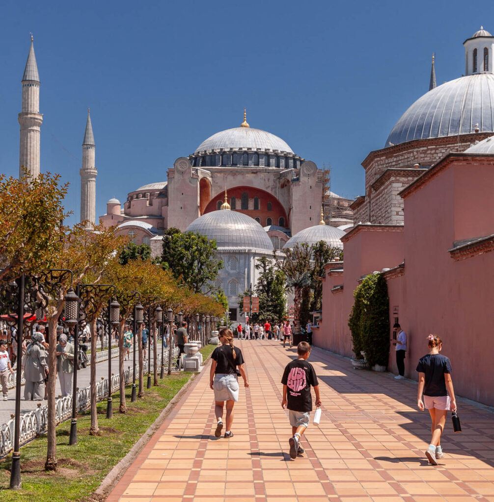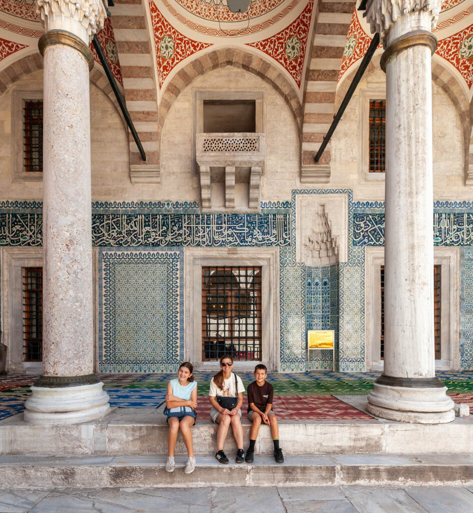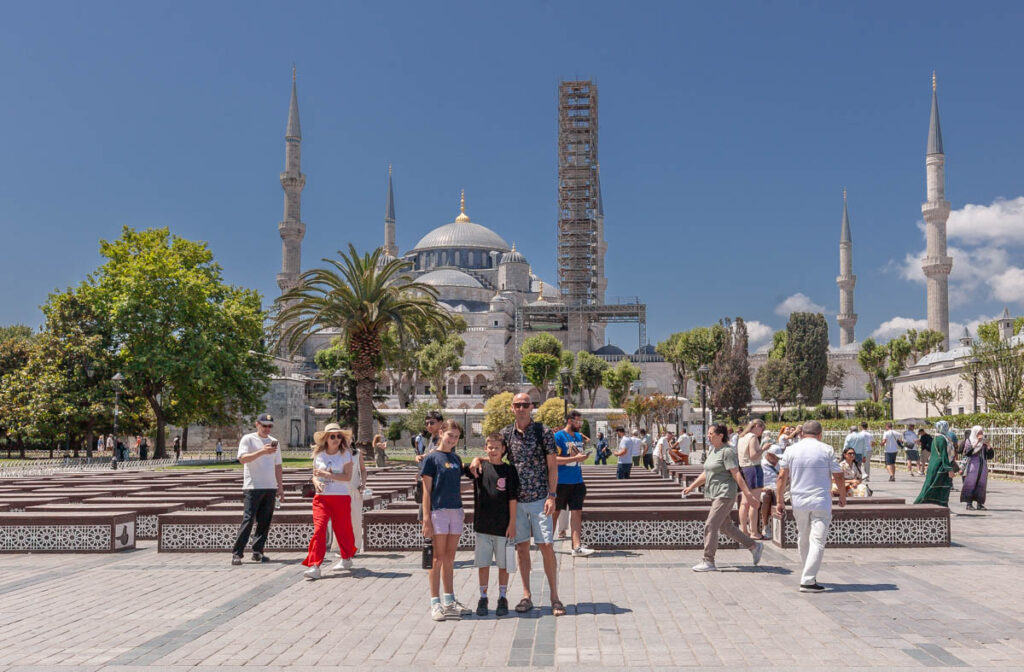 A visit to Istanbul wouldn’t be complete without touring the city’s main religious sites of the Blue Mosque and Hagia Sophia. Quite the memorable experience lining up to enter the mosque: the girls were required to cover their heads with shawls and their legs with mosque-provided skirts out of respect. The Blue Mosque (and a number of the other mosques in central Sultanahmet) were incredible to take in, their towering domes and skyward-reaching spires dominating the skyline. Neighboring the Blue Mosque, Hagia Sophia was built by the Eastern Roman Empire almost 1000 years ago but we didn’t venture inside this trip: when we visited in 2009 it was still recognized as a Christian museum and was free to enter, but with the continued Islamic tilt of Turkish culture was redesignated as a mosque in 2020 and is now closed to the public (there was a museum in part of the structure but it was $120 for the four of us to enter to so we took a pass…).