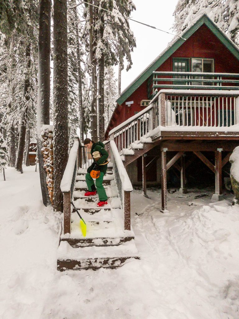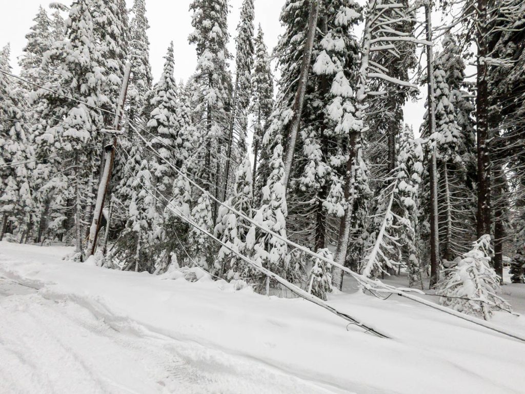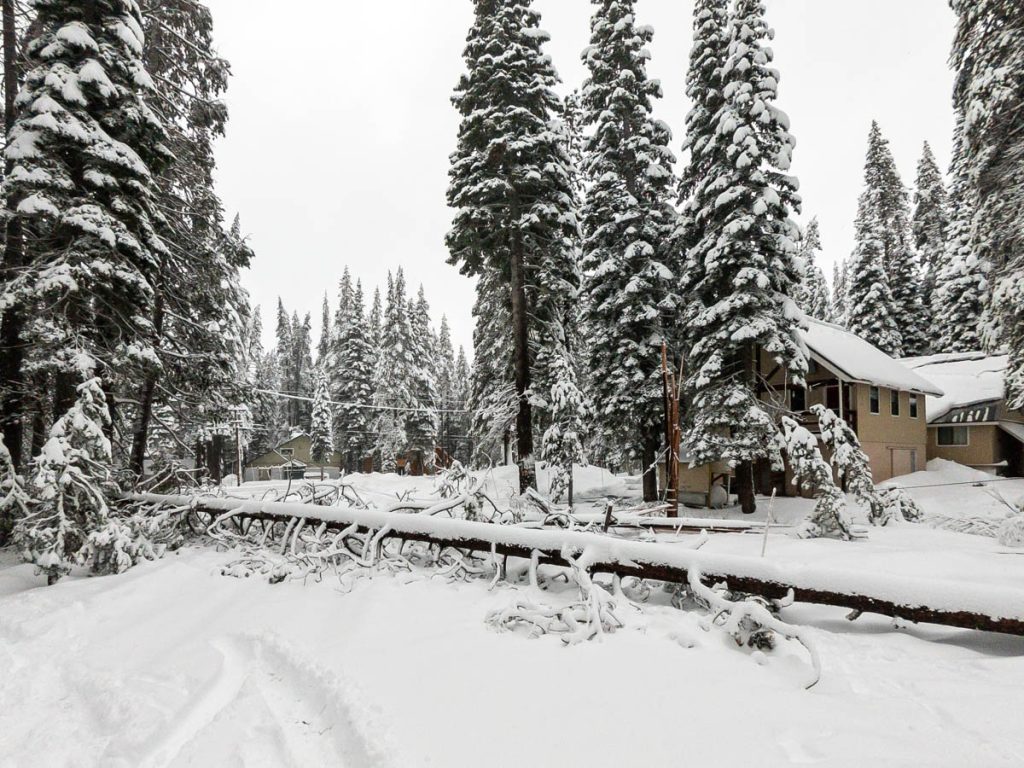 Last night the beep of the bluetooth speaker woke me up at about 10:00PM, which happens when the power cycles on and off. I opened my eyes and none of the usual faint LEDs were on in our bedroom: no power. Fortunately I’d brought the little propane stove with me for the winter up here so Lisa and I were able to enjoy some hot coffee and tea while we prepped breakfast and lunch by flashlight in the dark. The storm that began on Christmas Eve just kept on coming after a bit of a lull on Christmas Day, hitting the Sierras with ferocity after we’d all gone to bed on post-Christmas dinner. The pics below are of a huge fir that toppled in the storm, colliding with an adjacent power pole and snapping it in two. Live wires were strewn across the street when we woke up this morning, and another large tree knocked out some high voltage transmission lines just down the road to kill power to all of Donner Summit. Yes, even Sugar Bowl.