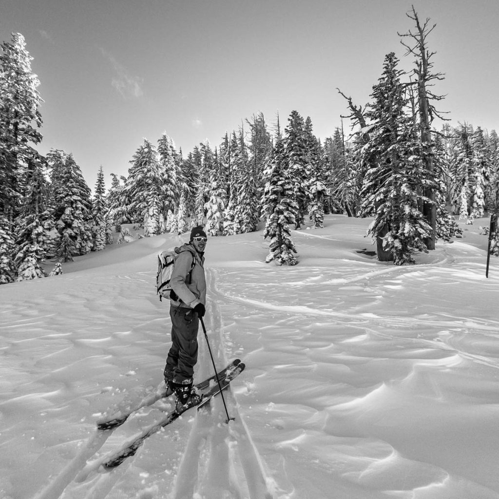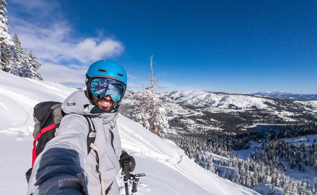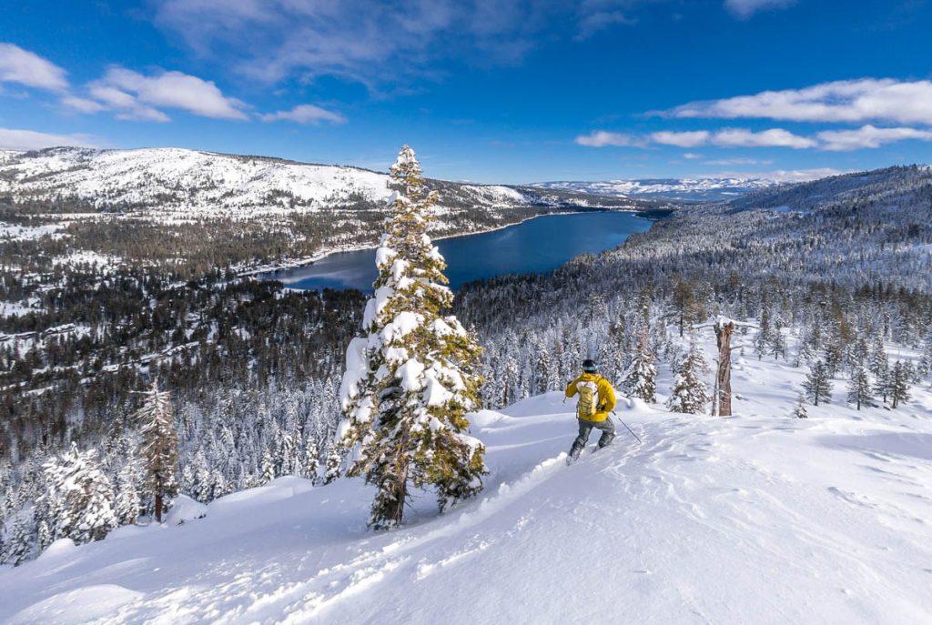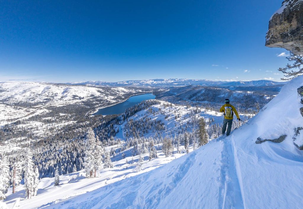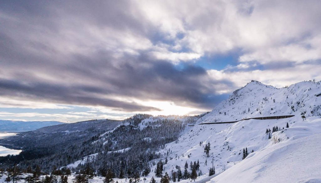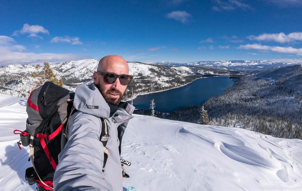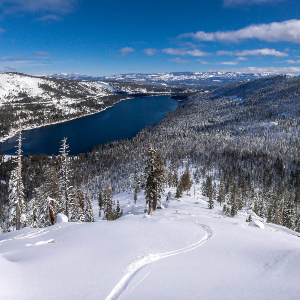 With all that fresh snow on the Sierras, Paris and I took advantage of a bit of a break in the weather to punch in our first lake run of the season: over 2000 vertical feet of untracked pow from Donner Peak to the west end of Donner Lake. It was a magic morning as we climbed along the edge of Sugar Bowl’s boundary shortly after dropping Wild Man off to school for day two of his winter quarter, scattered clouds and views for miles as we climbed up the back of Donner Peak.