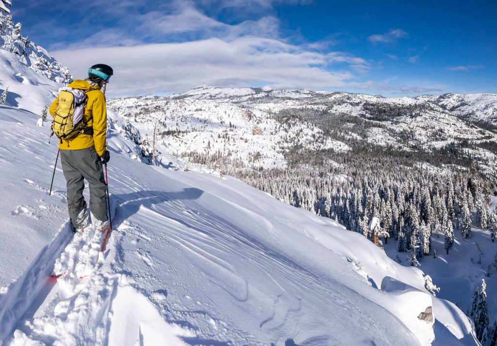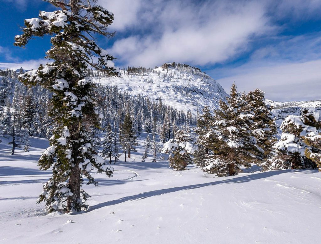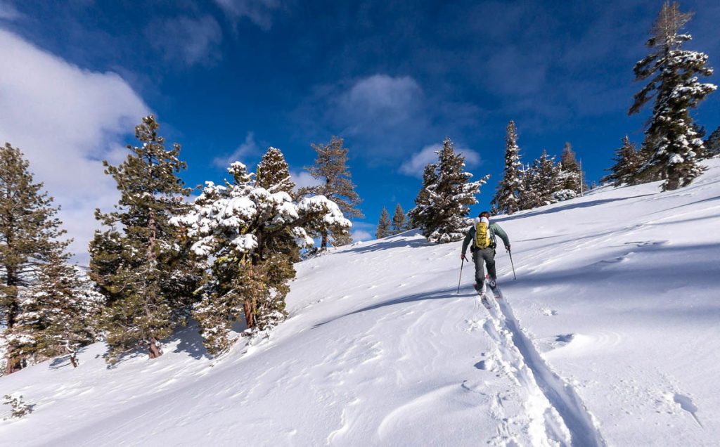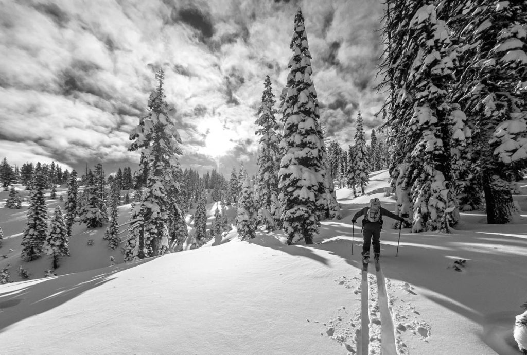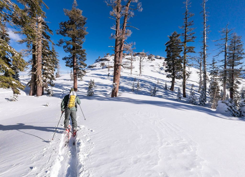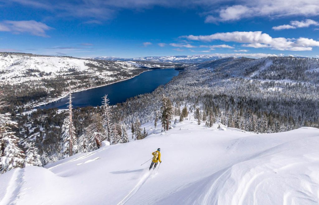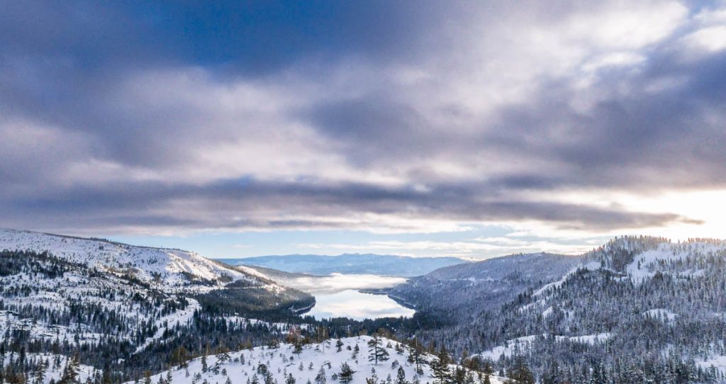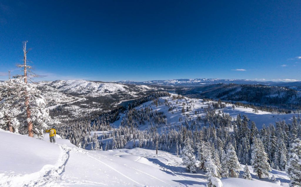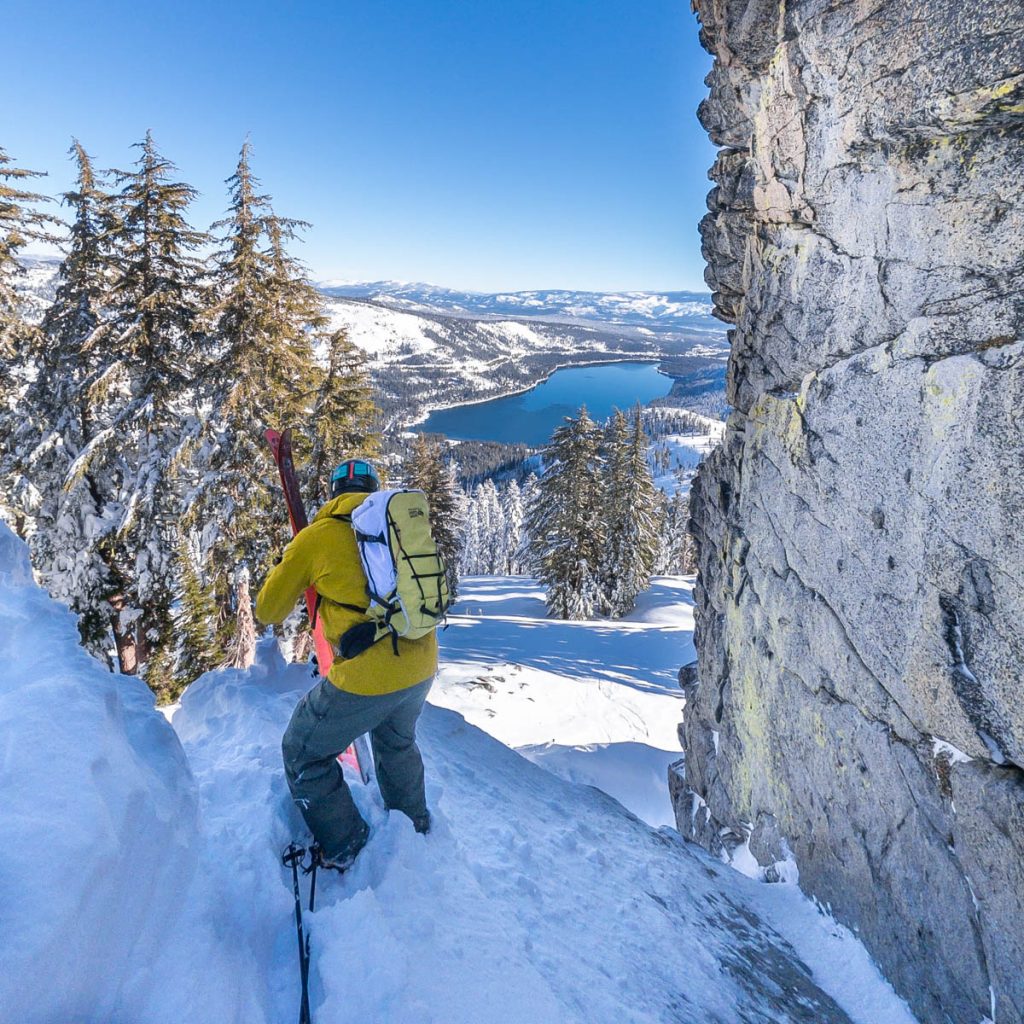 With all that fresh snow on the Sierras, Paris and I took advantage of a bit of a break in the weather to punch in our first lake run of the season: over 2000 vertical feet of untracked pow from Donner Peak to the west end of Donner Lake. It was a magic morning as we climbed along the edge of Sugar Bowl’s boundary shortly after dropping Wild Man off to school for day two of his winter quarter, scattered clouds and views for miles as we climbed up the back of Donner Peak.