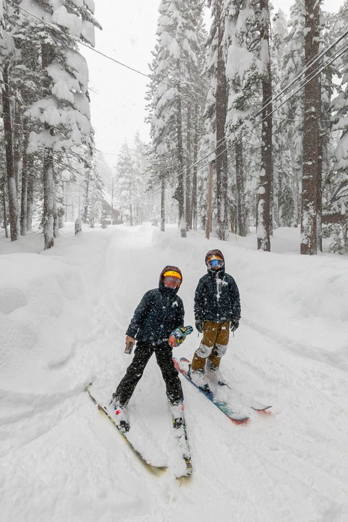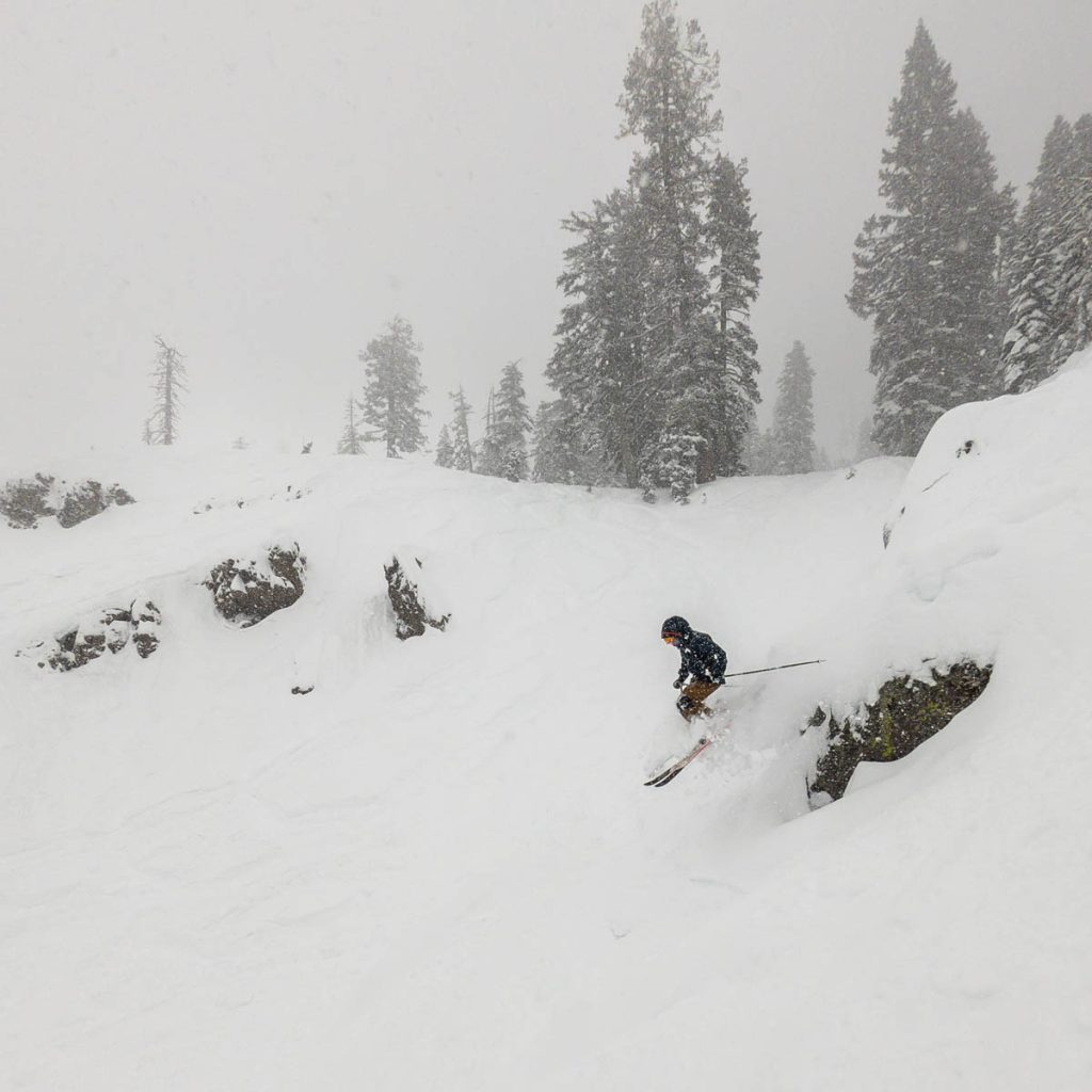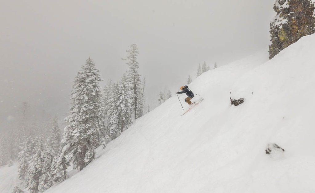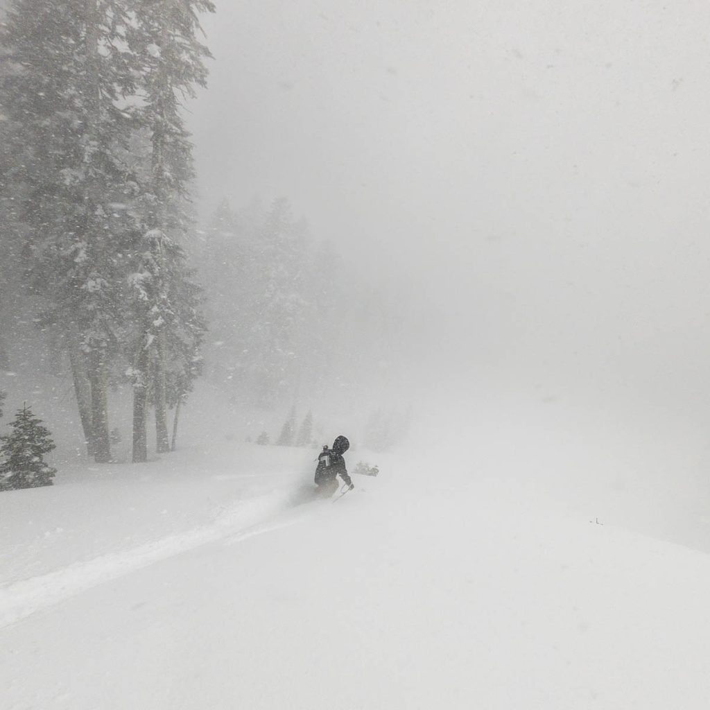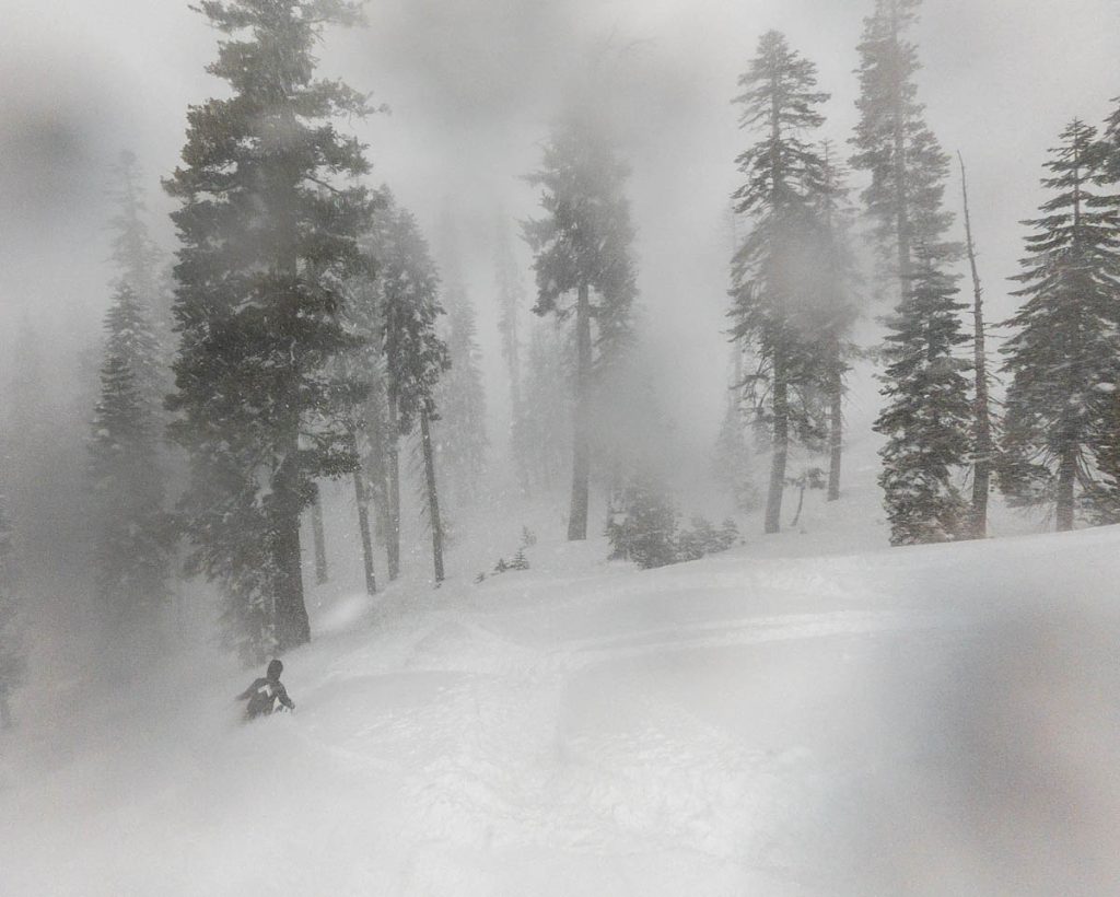 The resort was almost empty except for the handful of diehards who live up on the summit and some residents of village, but it was well worth the white-knuckle drive up Donner Pass Road once we arrived: bottomless pow everywhere we looked. Even thought the bulk of the resort was open most of it was unskiable, it was just too deep, especially for someone as light as Max. I was even struggling to keep my momentum on anything but the steepest of pitches and found myself wishing I had a set of Paris’ Blizzard Spurs underfoot with their almost snowboard-like 127 millimeter waist. I stuck close to Wild Man, it was up to his waist in sections and I was a little wary of him disappearing down a tree well. We managed to get some great turns in before the resort fully shut down around noon, likely influenced by the news of a tragic backcountry avalanche a few miles away below Castle Peak.