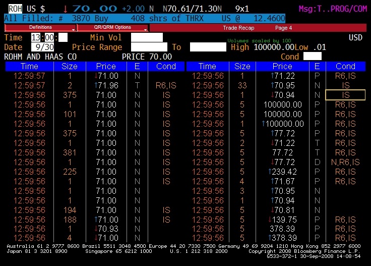 I’d imagine there were quite a few very happy market participants today who thought they’d bought Google at $0.01 and $0.02, or even in the $200.00 range; as well as a number of ecstatic sellers of Rohm and Haas who walked away with sales at $100,000.00. However, the exchange rules all, and after the markets had closed the NYSE (for ROH) and NASDAQ (for GOOG) announced that they’d be canceling all the ‘erroneous’ prints for both names. For Google the exchange had to even alter the closing price, GOOG initially closed at a $341 handle but was revised to its fair price above $400 after the exchange canceled all trades below $400 for the day. All the trades below $400 for GOOG and above the $100 level for ROH make me wonder: what happens to all those off-exchange trades in dark pools and crossing networks that are outside the official control of the NASDAQ and NYSE? Buyer (seller) beware when using ECNs and dark, I guess. And buyer [seller] beware when placing market orders, too, even if the name is heavily traded and usually very liquid! Just another chapter to the September madness…