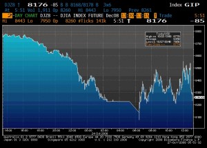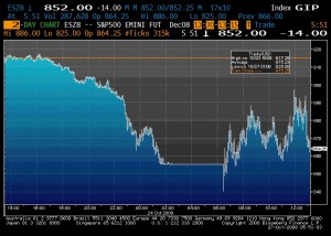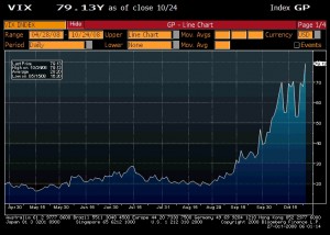 I meant to put this up last Friday but got a little tied up…  Anyway, there’s been a lot of markets halted since this whole fiasco started last August, but the majority of market closures and halts occur in often overlooked, developing markets like Russia and Indonesia (I put up a post about it here a while back: Let’s Just Close the Markets?).  You don’t often see the US market main index futures or equity exchanges halt trading.  Nothing should come as surprising in the financial markets these days, times when the forward looking volatility of the US markets is at its highest ever levels (right) and a day of 5% losses or gains is commonplace, but I wanted to post Friday’s major index halts because it’s a little out of the “ordinary” to see this happen.  The last time an NYSE circuit breaker was triggered was during the Asian financial crisis in October 1997 in an attempt to stem similar panic-drive losses to those experienced on Black Monday in 1987, when the circuit breakers and futures limit-downs were first instantiated.  On Friday we didn’t see the NYSE halt, but overnight we did see the futures limit-down during the early hours of London trading.  Below are the S&P 500 (left) and Dow Jones Industrial Average (right) futures contracts intra-day price action plots for Friday October 24.
